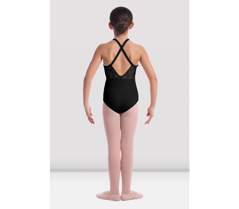 Our girls Mirella Daisy camisole leotard features a lace bodice with a scoop neckline and an open cross strap back. Part of the Children's Mirella Daisy collection featuring daisy print panels fashioned in soft stretch lace in a classic color palette.